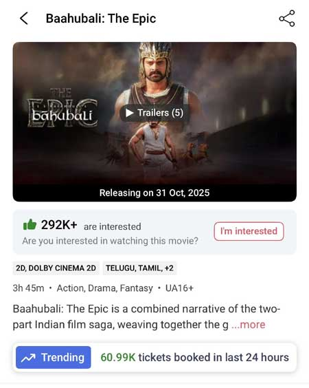 మొదటి రోజే 61,000 టికెట్లు అమ్ముడవడం సినిమా పట్ల ఉన్న ఉత్సాహాన్ని స్పష్టంగా చూపిస్తోంది. థియేటర్లు, మల్టీప్లెక్సులు అన్ని చోట్ల కూడా హౌస్ఫుల్ షోలు ఉండే అవకాశం ఉంది. ఈ వేగం కొనసాగితే, బాహుబలి: ది ఎపిక్ భారతీయ సినిమా చరిత్రలోనే అతి పెద్ద రీ–రిలీజ్ ఈవెంట్గా నిలవవచ్చు.